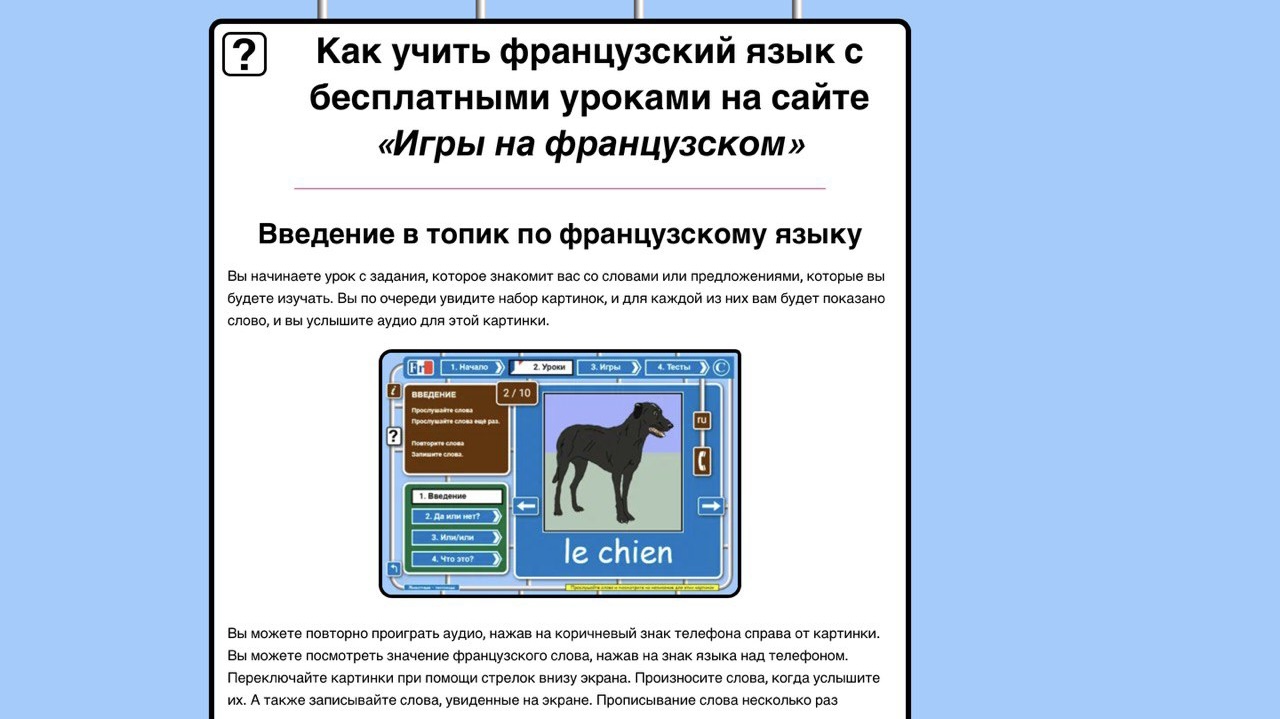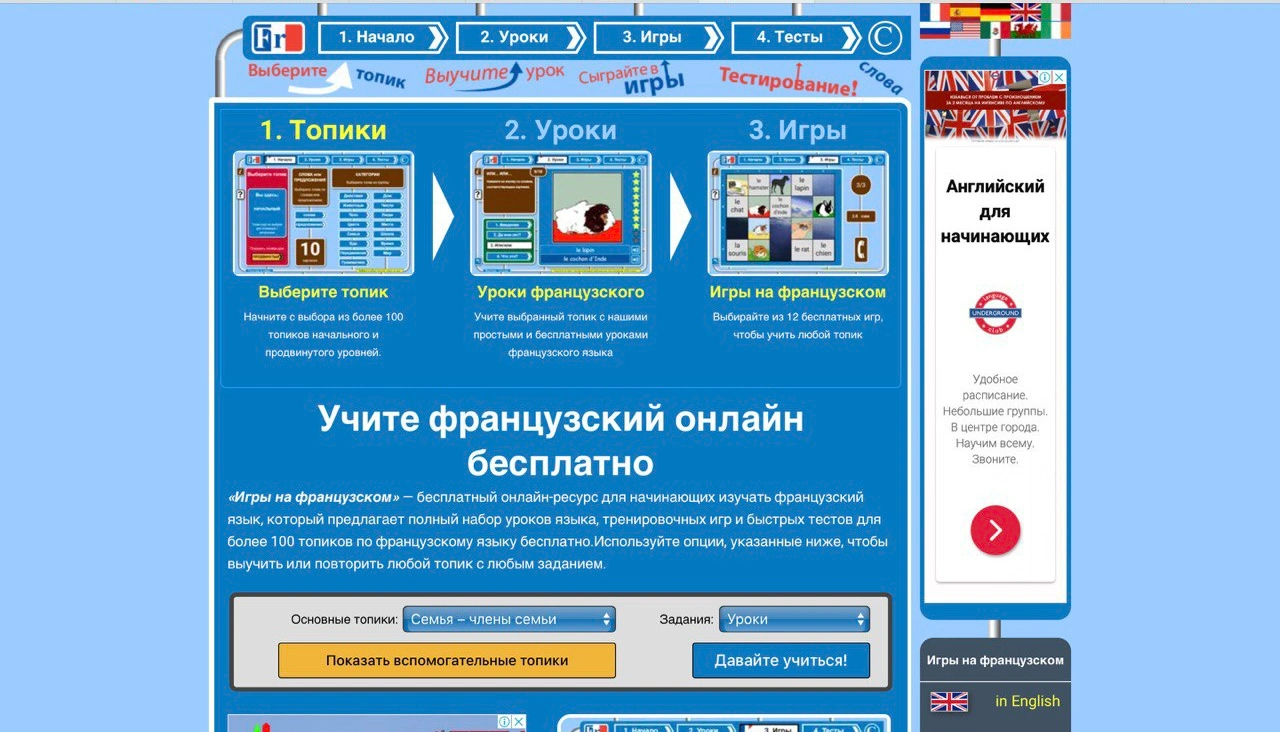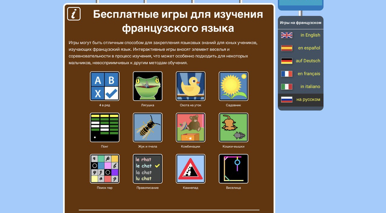 «Игры на французском» – бесплатный онлайн-ресурс для начинающих изучать французский язык, который предлагает полный набор уроков, тренировочных игр и быстрых тестов для более 100 топиков по французскому языку бесплатно. Используйте опции, чтобы выучить или повторить любой топик с заданием.